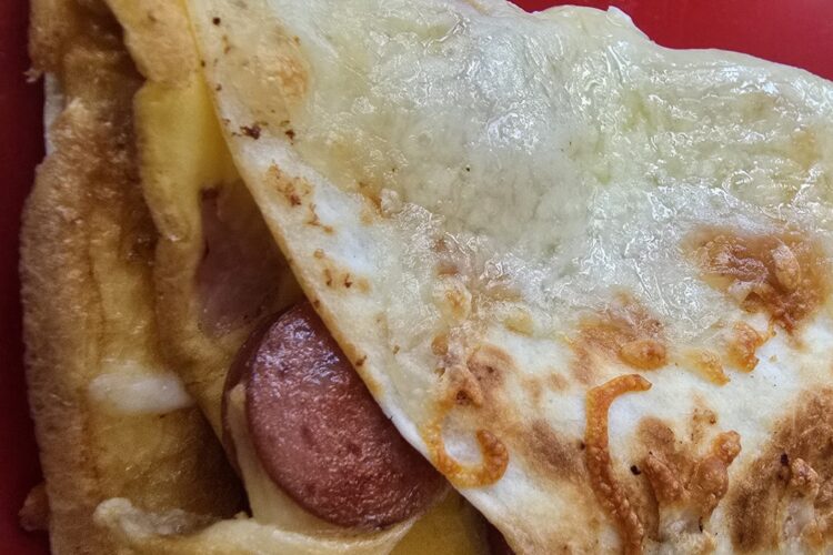 To prepare the first roll, place a pancake pan over medium heat and add 1 teaspoon of butter. Once it’s melted, add one-third of the chopped ham and one-third of the sausage slices into the pan. Let them sizzle for about 30 seconds to bring out their aroma and start browning slightly. Pour one-third of the beaten eggs over the meat, gently tilting the pan to spread the mixture evenly. While the eggs start to cook, sprinkle 25 g of grated Parmesan across the surface and place one triangle of cream cheese in the center.